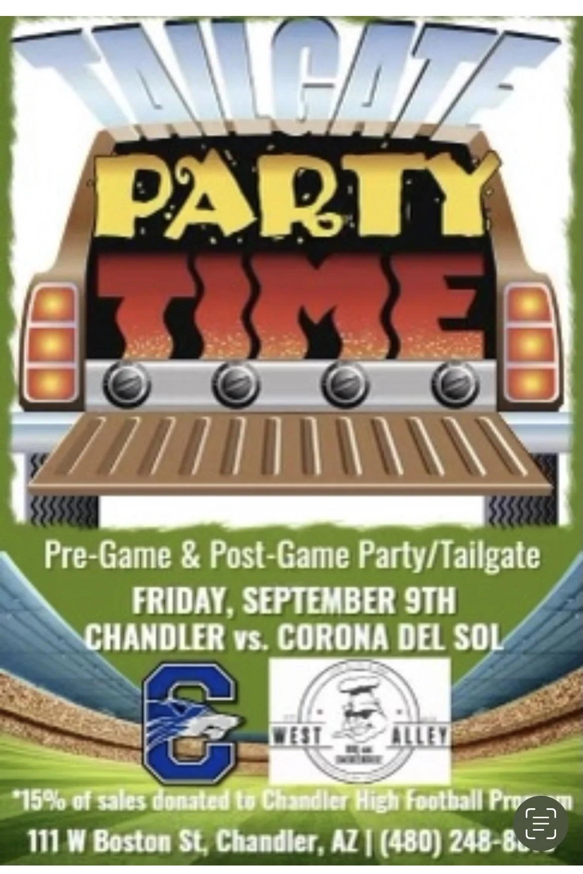 Come join us for good food, fun, and to support the Chandler High Football Program! This Friday, September 9th, 2022, West Alley BBQ in downtown Chandler is hosting a Pre-Game and Post-Game Party/Tailgate, with 15% of sales donated to the Chandler High Football Program. A BIG thank you to West Alley BBQ-now let’s show them how much we love them by supporting them and showing up BIG TIME!!! Show ‘em how our Wolves can tailgate and support our team!